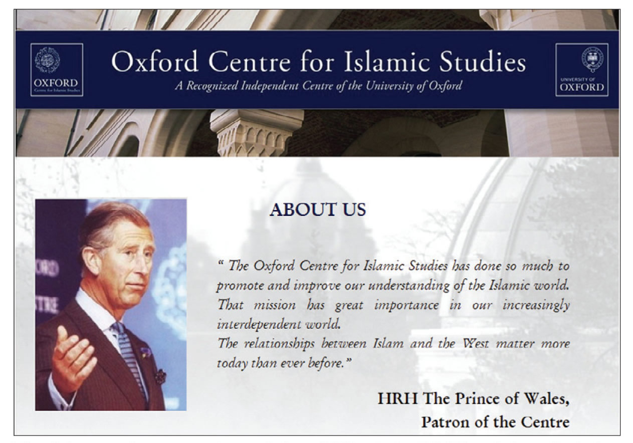 Oxford Timesin mukaan 10. toukokuuta 2012, Charles on ollut OCIS:n innokas tukija sen perustamisesta lähtien. Vuonna 1993 hän tuli sen suojelijaksi ja on niin vaikutusvaltainen sen aktiviteeteissa että lehdistö joskus kutsuu sitä “Charlesin OCIS:nä”. Yksi OCIS kanssaperustajista on Abdullah Omar Naseef, nimetty syyskuun 11. uhrien perheiden tuomissa oikeustapauksissa hänen roolistaan lentokonekaapparien tukijana.