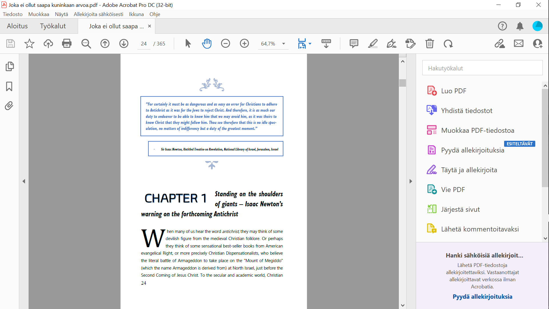 Julkaisen vain tällaisen ilmoitusmuotoisen lyhyen päivityksen. Reilu viikko sitten aloin työstään kirjastani Joka ei ollut saapa kuninkaan arvoa – Antikristus paljastettu? (Books on Demand, 2019) englanninkielistä laitosta. Olen saanut kirjoitetuksi jo kaksi ja puoli lukua siitä. En ole vain kääntänyt vanhaa kirjaani vaan olen kirjoittanut sen lähes kokonaan uusiksi ja jättänyt vain muutamat olennaisimmat kohdat paikoilleen. Myös lukujen aihe on edelleen sama. En ollut ihan tyytyväinen niiden sisältöön, joten päätin muotoilla argumenttini eri tavalla ja edetä kirjoituksessa entistä yhtenäisemmin ja johdonmukaisemmin, keskittyä olennaiseen ja jättää kaikki turha lätinä pois. Sitä paitsi uuden tekstin tuottaminen on minulle paljon motivoivampaa kuin vain vanhan kertaaminen. Näin löytyy myös usein uusia näkökulmia ja uutta tietoa kun tekee samalla tutkimustyötä kirjoittaessa.