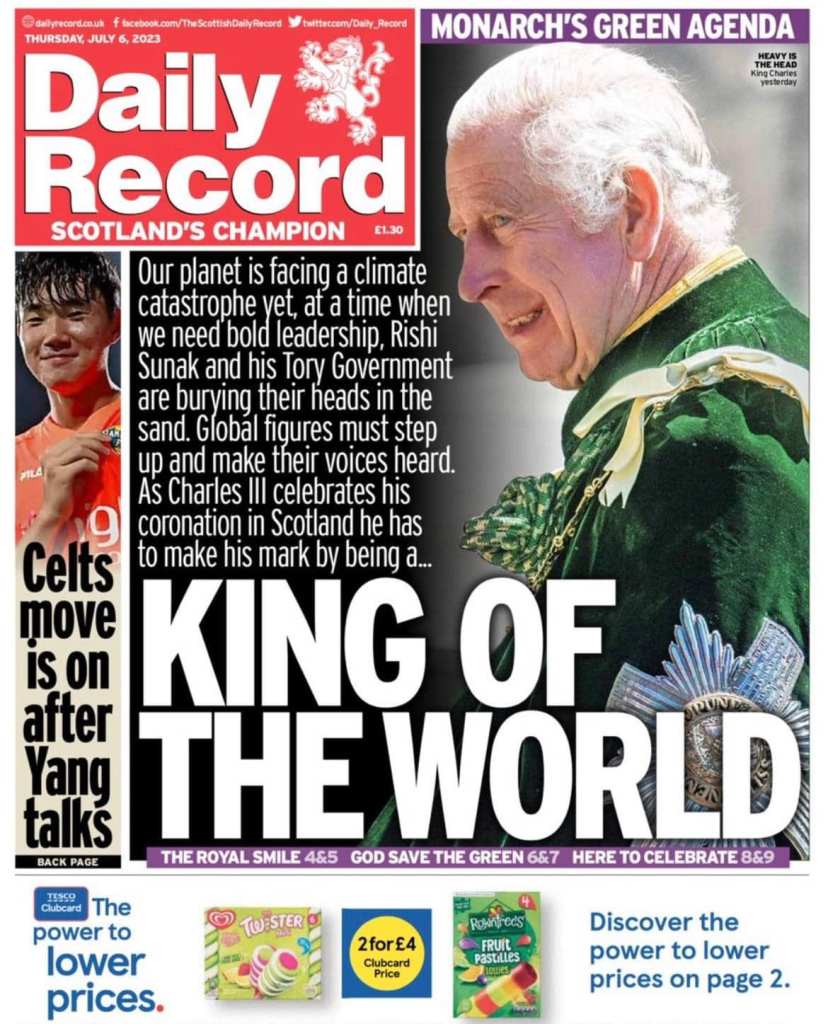 On 5 July, a separate from the May coronation, ceremony was just held in Scotland where Charles III was also crowned King of Scotland. When Charles arrived at the coronation, the crowd in the background had gathered not to cheer him on but to protest with yellow signs reading “Not my king!”. The same angry shouts could be heard in the background as Charles got out of his car for the coronation ceremony. This fits Daniel’s description of this unpopular king: “And in his estate [on the throne] shall stand up a vile person [Hebrew bazah, meaning despised], to whom they shall not give the honour of the kingdom.” But while the people did not want him to be crowned even the King of Scotland, the Scottish news papers were already crowning him the king of the world. The Scottish tabloid Daily Record wrote on its front page headline: ‘Our planet faces climate catastrophe. Yet, at a time when we need bold leadership, Rishi Sunak and his Tory government are burying their heads in the sand. Global figures must stand up and make their voices heard. When Charles celebrates his coronation in Scotland, he must make his mark in history by being KING OF THE WORLD.”