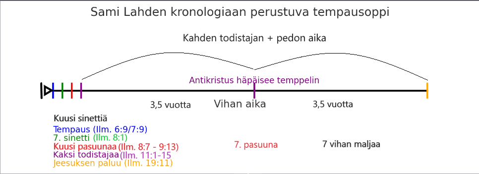 Lähetin yläpuolisen kaavion Sami Lahden itsensä tarkistettavaksi ja hän vahvisti sen esittävän hänen näkemyksiään oikein. Tässä kronologiassa tempaus siis esiintyy ennen tuota seitsenvuotista jaksoa, kuten pre-tribulationistit jo opettavat. Mutta merkittävin ero edellä kuvatun pre-tribulationismin standardiversioon1 Samin kronologiassa on se, että tuo seitsenvuotinen ajanjakso ei käynnisty siitä kun Karitsa avaa ensimmäisen sinetin Ilmestyskirja 6:1:ssä vaan vasta seitsemän sinetin ja kuuden pasuunan jälkeen.2 Ja vaikka tempaus esiintyykin ennen tuota seitsenvuotisjaksoa, se ei esiinny Johanneksen taivaaseenoton yhteydessä Ilmestyskirja 4:1:ssä ennen sinettien, pasuunoiden ja maljojen aikaa, vaan vasta kuuden ensimmäisen sinetin jälkeen Ilmestyskirja 7:9:ssä.3