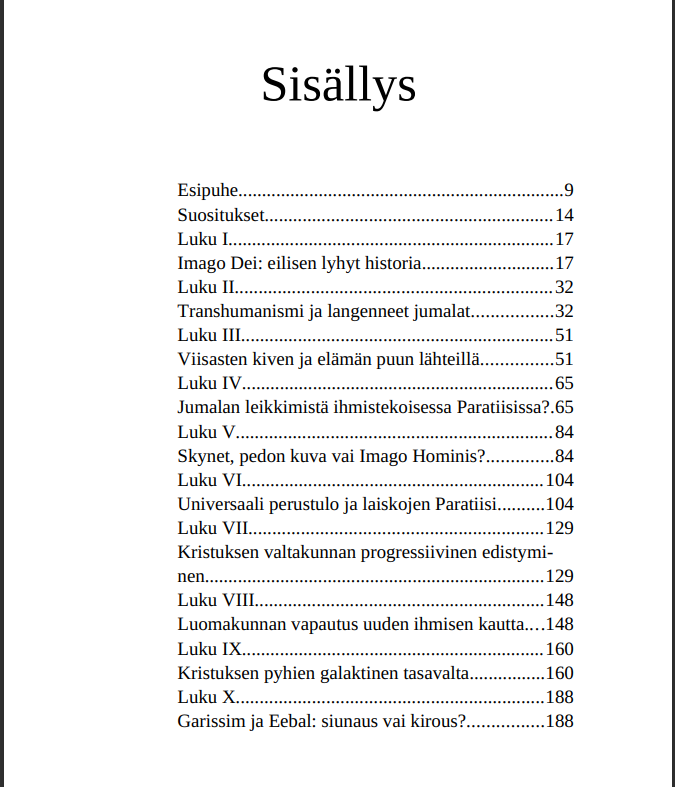 Jos teet siis tilauksen BoD:in kirjakaupassa jo tänään, kirja saattaa ehtiä yhä jouluksi kotiin. Tässä on erinomainen joululahja lukijalle, jota saattaisi kiinnostaa hyvin ajankohtaiset aiheet, kuten tekoäly, robotikka, puettavat tai kehonsisäiset teknologiat, nanoteknologia, geeniteknologia, kybernetiikka, yms. kristillisen eskatologian ja raamatullisen ihmiskuvan valossa. Kirjani tarkastelee syvällisesti transhumanistisen liikkeen filosofiaa juutalaiskristillisen perinteen ja raamatullisen ihmiskuvan valossa, tarjoten aiheeseen sekä kriittisen että myönteisen näkökulman. Kirjassa on 10 lukua ja vain yhden luvun sisältö (luku 6) on kopioitu suoraan jo julkaistuista blogiteksteistäni. Muut luvut ovat ennen julkaisematonta materiaalia.