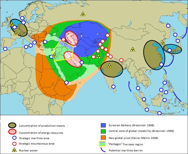 Selkkauksen ei tarvitse rajoittua vain Keski-Aasiaan täyttääkseen uuden Suuren pelin kriteerin vaan sen tulisi sijoittua tuolle alueelle mitä alapuolinen kartta kuvaa strategisten energialähteiden ja merireittien globaalina ydinkeskittymänä.